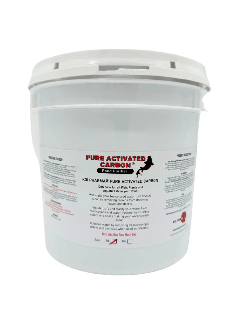 - Use 2.5 pounds of Koi Pharma® Pure Activated Carbon per 1,000 gallons of pond water.
